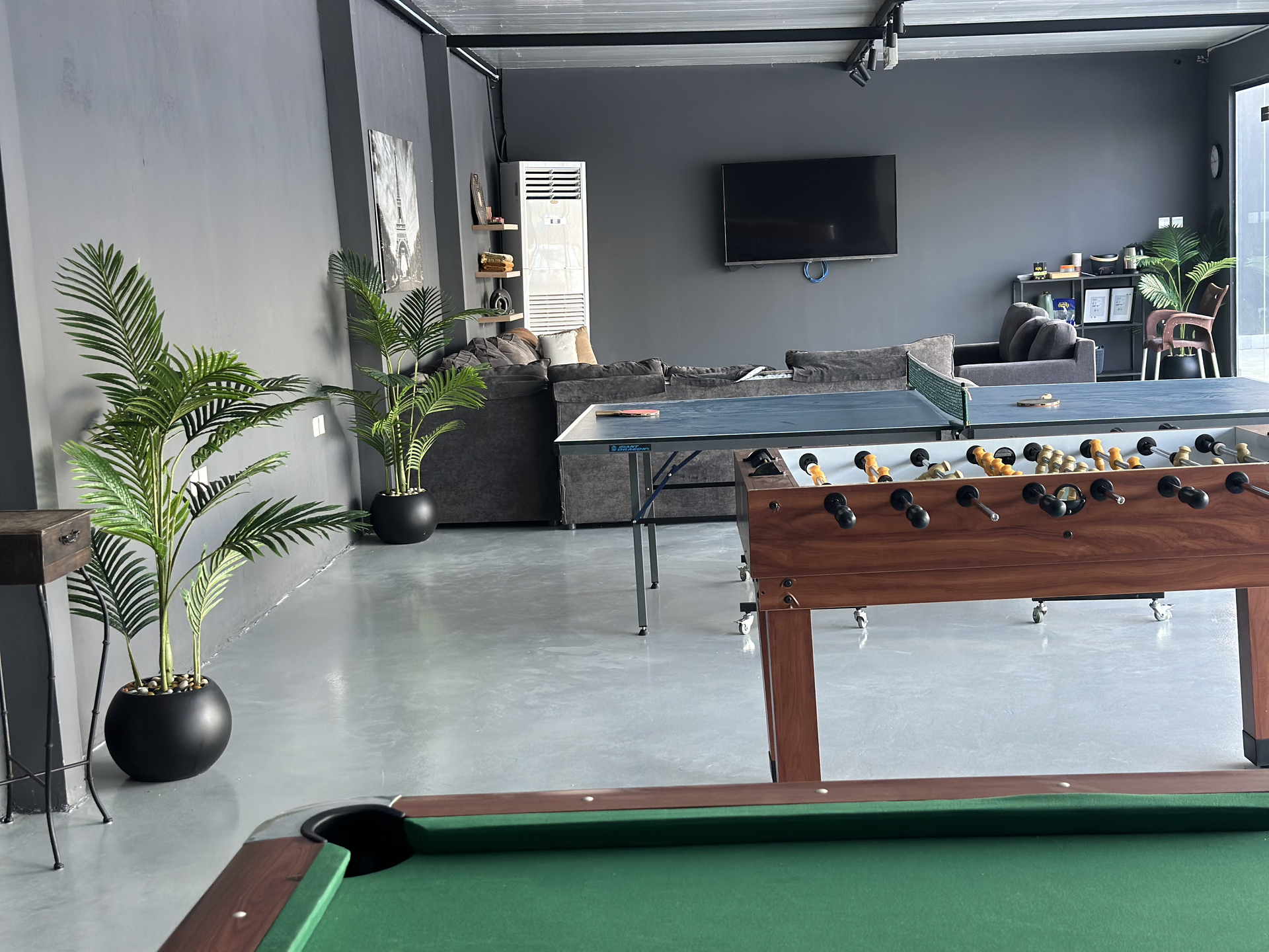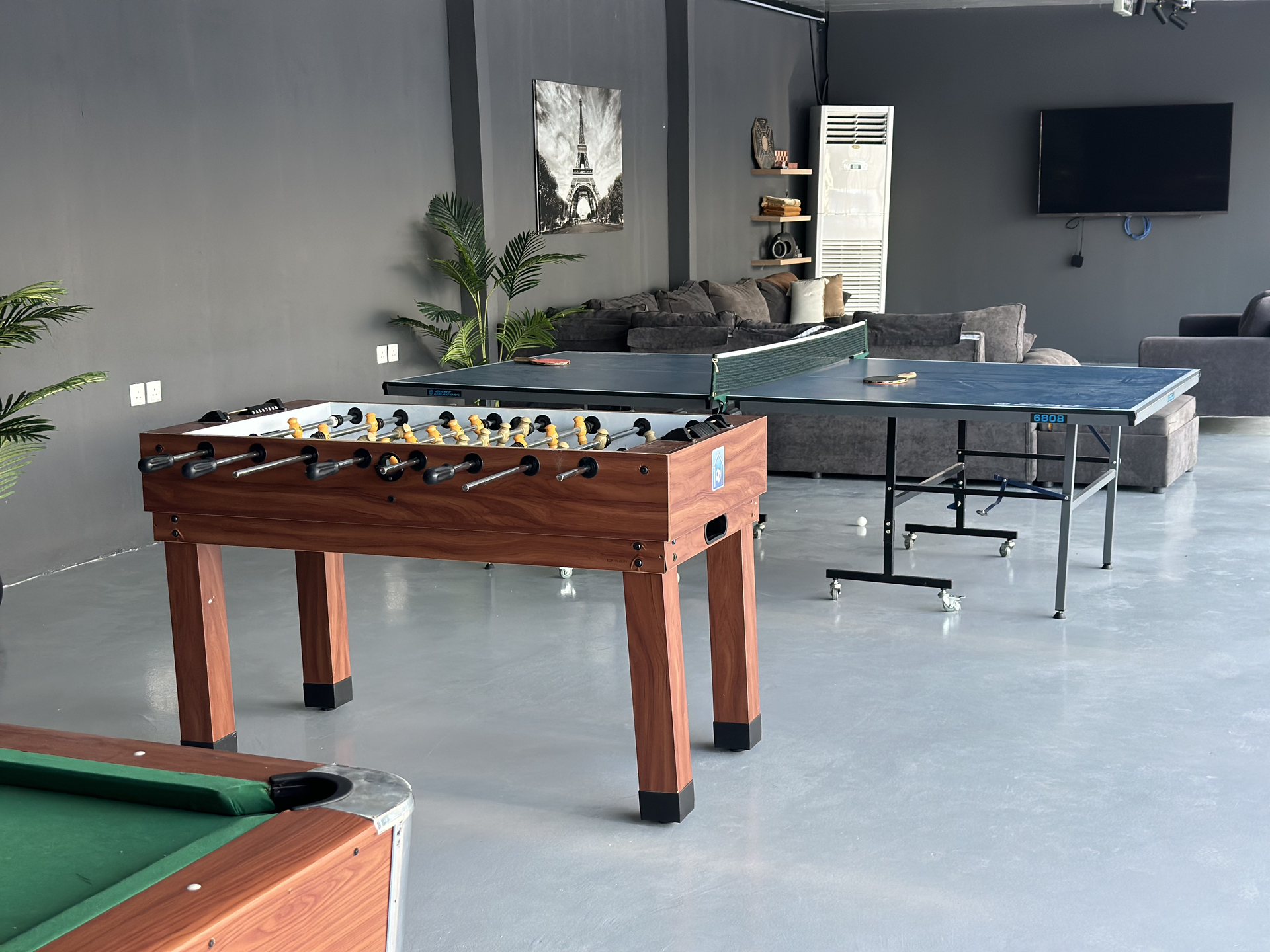 لاونج مطل على ملعب البادل ومجهز بوسائل ترفيهية مثل طاولة بلياردو وطاولة تنس وفرفيرة ركن قهوة لمتعة استثنائية أثناء حجزك